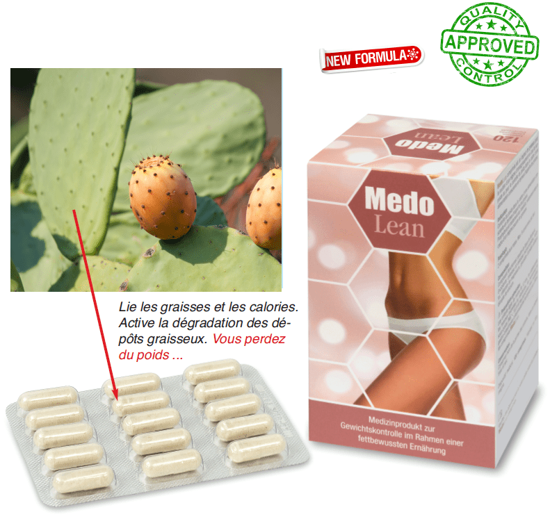 Le secret de l’amincissement dans MedoLean est une nouvelle formule de complexes de fibres naturelles et végétales provenant d’une espèce de cactus d’Amérique du Sud. Après ingestion, il aspire les graisses et les calories de votre nourriture comme une éponge et les élimine sous forme d’indigestes liés. Les graisses et les calories neutralisées ne sont plus disponibles pour votre corps. Cependant, l’organisme a besoin de graisses pour produire de l’énergie pour votre bien-être. Maintenant, il faut aller chercher la graisse ailleurs ….